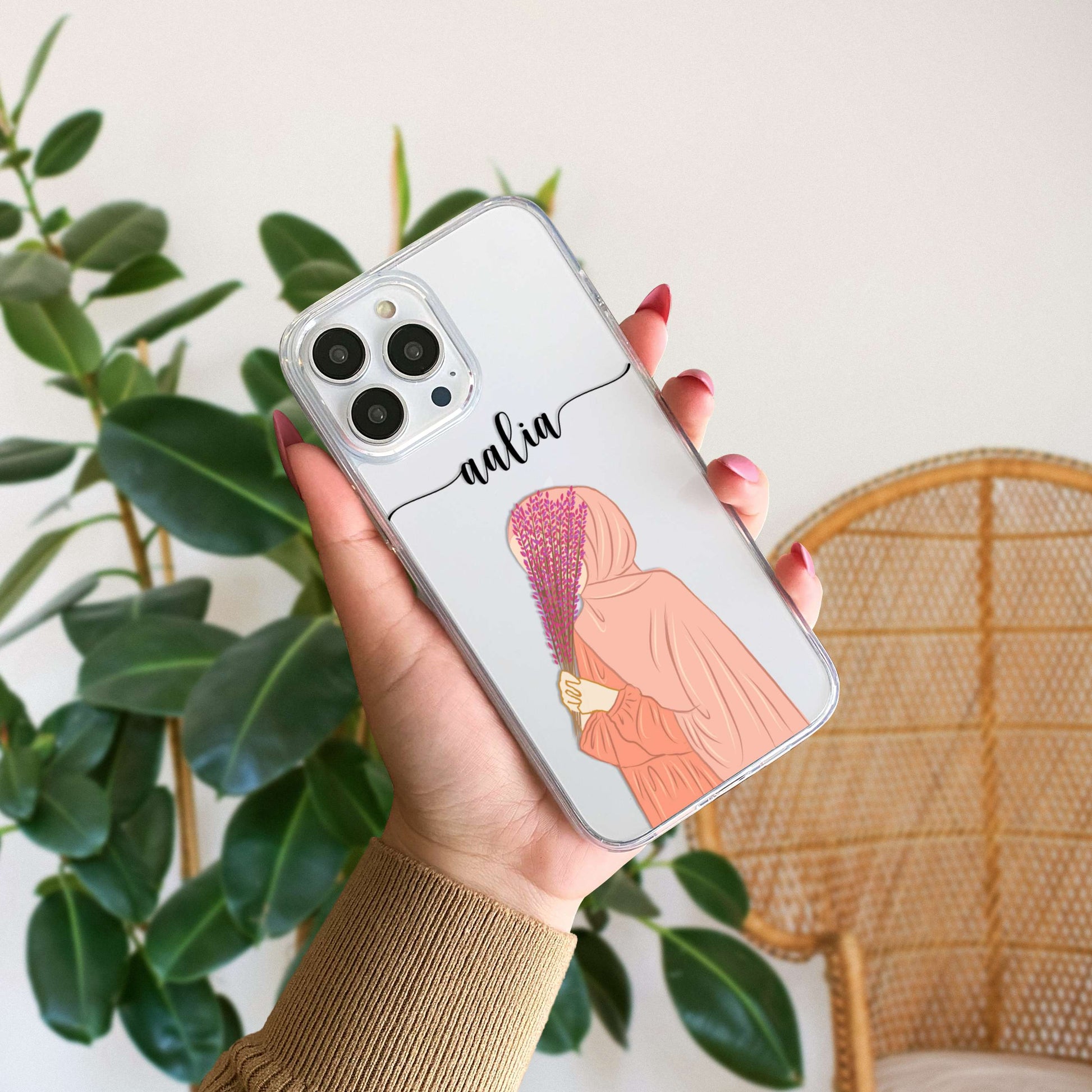 Hijab Girl Holding Flower Custom Name Transparent Silicone Phone Case Design 17