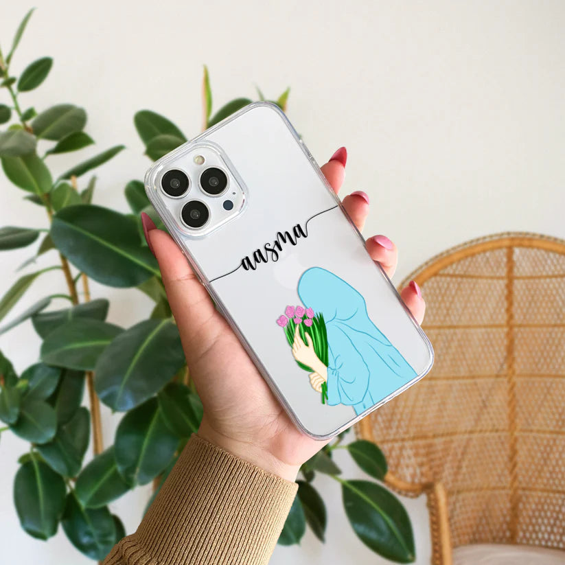 Hijab Girl Holding Flower Custom Name Transparent Silicone Phone Case Design 3