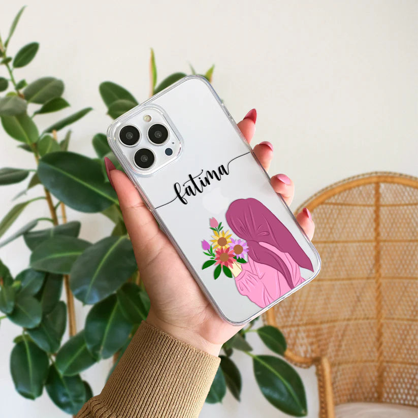 Hijab Girl Holding Flower Custom Name Transparent Silicone Phone Case Design 4